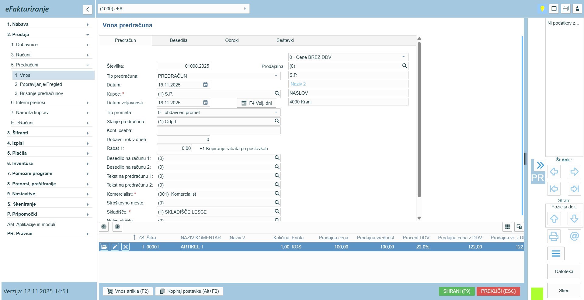 - Prodajalna: če ima naš kupec več prodajaln, potem jo lahko izberemo iz šifranta in se bo namesto naziva in naslova kupca izpisal naziv.