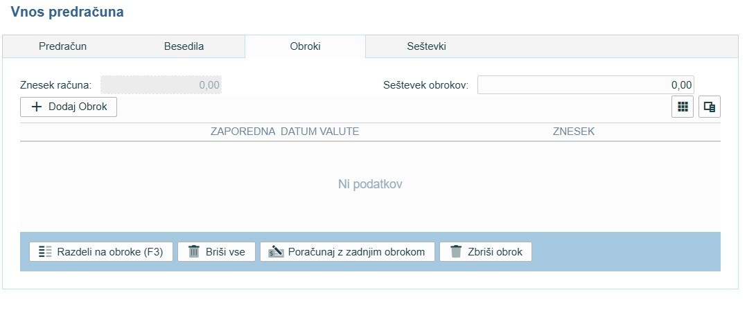 Če želimo ročno določiti obroke, potem pritisnemo gumb Dodaj obrok, kjer ročno razdelimo obroke. V primeru, da želimo obroke avtomatsko razdeliti, uporabimo gumb Razdeli na obroke (F3), kjer vpišemo želeno število obrokov in datum prvega obroka.