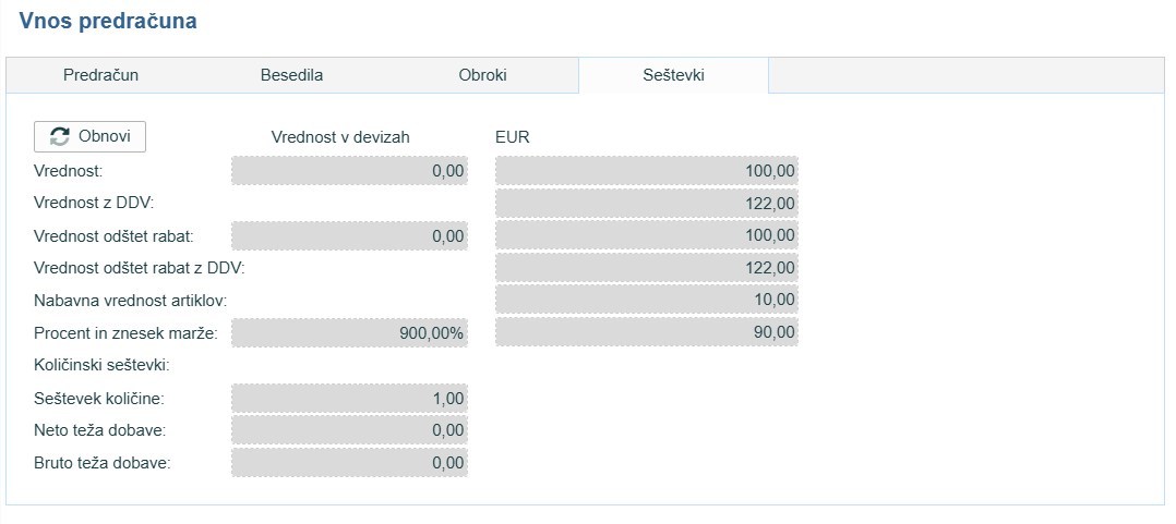 Prikazuje končne vrednosti dokumenta. V primeru, da imate vklopljen parameter devizni predračuni, vam omogoča, da vidite znesek v tuji valuti in v domači.