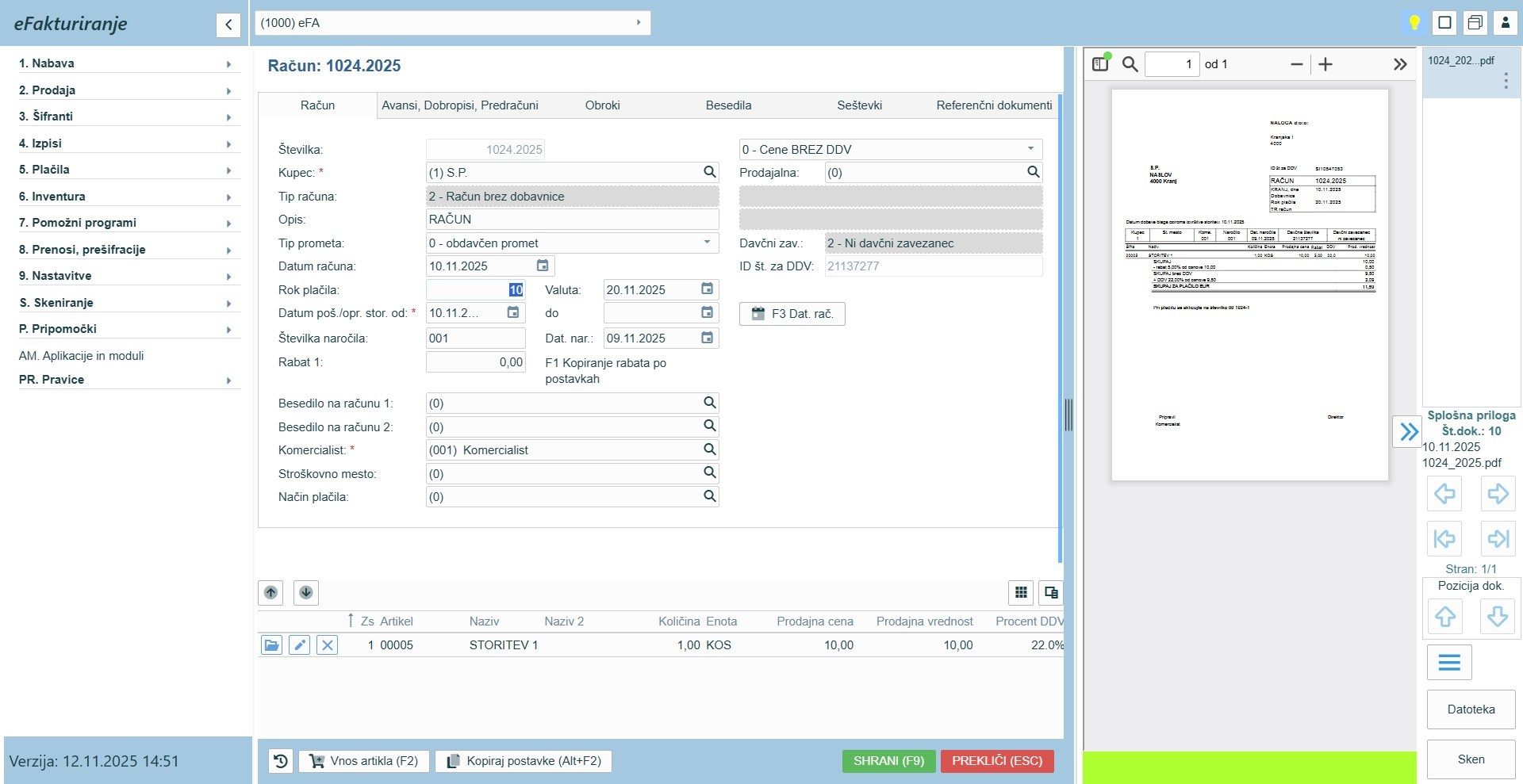 Po kliku na račun se vam odpre račun, ki vsebuje enako masko, kot ste jo navajeni na vnosu računa.