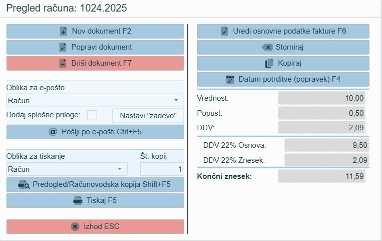 Če želite račun le pregledati, ga lahko natisnete preko gumba Pregled (F5). Vsebino računa lahko v primeru, da je bil račun že kadarkoli natisnjen, vidite tudi na desni strani ekrana.