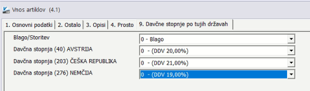 Pri posameznem artiklu je potrebno določiti davčne stopnje za države, v katere prodajate. Odprite Vnos artiklov (4.1) in izberite zavihek Davčne stopnje po tujih državah.