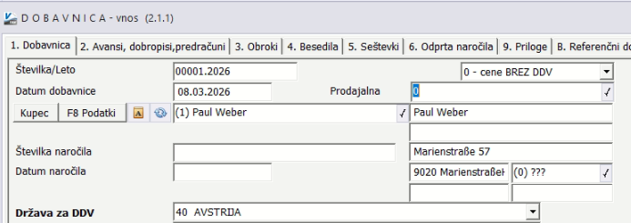 Pri izdaji prodajnega dokumenta (npr. dobavnica ali račun) program upošteva državo kupca. V obrazcu dokumenta se prikaže polje Država za DDV. Program državo praviloma samodejno predlaga iz podatkov partnerja. Ko je država določena (npr. Avstrija), program pri dodajanju artiklov samodejno uporabi davčno stopnjo, ki je bila za to državo nastavljena na artiklu. Na ta način se na dokumentu uporabi pravilen DDV glede na državo kupca.
