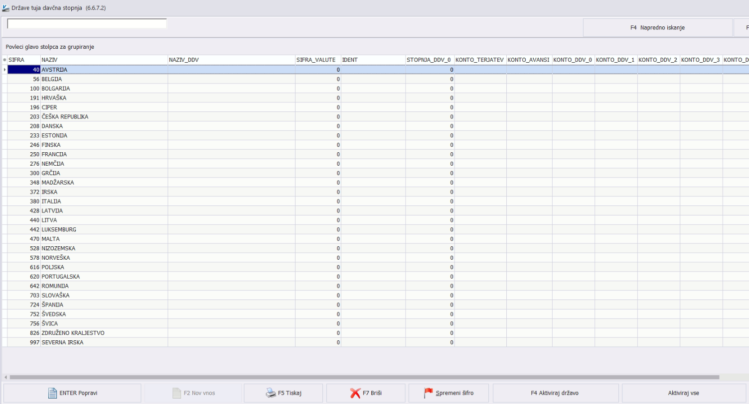 Najprej je potrebno aktivirati države, za katere boste uporabljali tuje davčne stopnje. Odprite meni Države – tuje davčne stopnje (6.6.7.2).