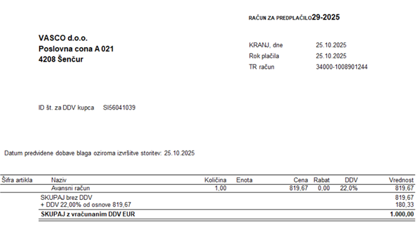 Za primer vzemimo prejet avans kupca v znesku 1.000,00 eur za katerega izstavimo avansni račun.