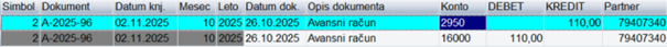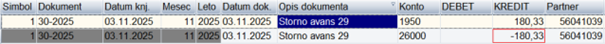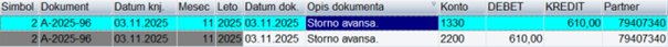 Dodamo knjižbe za storno avansa. Znesek davka avansa na debet konta 2950, zavihek DDV z vsemi posebnostmi.