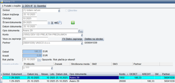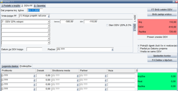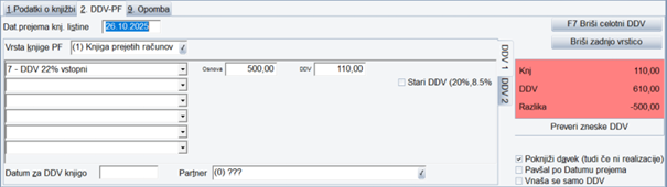 Za primer vzemimo, da smo svojemu dobavitelju nakazali 610,00 eur predplačila. Vodilna knjižba za znesek davka v višini 110,00 eur na konto 2950 (konto naj bo partnerski in označen za evidenco knjige prejetih računov), preko gumba »F8 Podatki DDV« vnesemo davčne podatke, obkljukamo parameter »Poknjiži davek (tudi če ni realizacije) in ne vnesemo Protikonta.