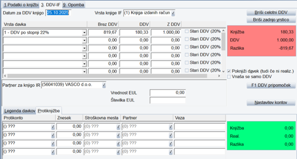 Naredimo klasične knjižbe za izdan račun, obvezno preko gumba »F8 Podatki DDV«, da vzpostavimo tudi evidenco KIR.
