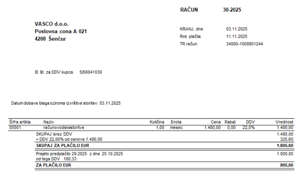 Naš končni račun ima vrednost 1.805,60 eur, od tega plačano preko avansa 1.000,00 eur, preostanek za plačilo 805,60 eur.