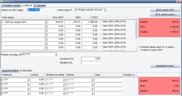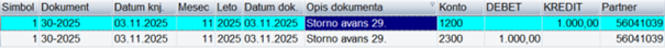 Nato sledijo knjižbe za zapiranje avansnega računa oziroma storno avansa. Vodilna knjižba za znesek davka avansa na konto 1950 na kredit, nato preko gumba »F8 Podatki DDV« storno evidence KIR. V primeru storno avansnega računa za vse oblike samoobdavčitev (76.a člen ter EU) ne obkljukamo parametra »Poknjiži davek (tudi če ni realizacije) in v Protikonto vpišimo enak konto kot za vodilno knjižbo, torej 1950.