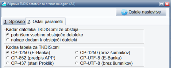 Na zavihku Ostali parametri pri »Kodna tabela za TKDIS.xml« izberete »CP-1250 (E-Banka)«