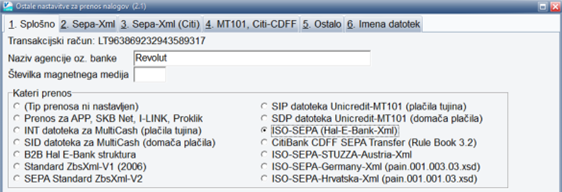 Desno zgoraj na gumbu »Ostale nastavitve« na zavihku Splošno pod »Kateri prenos« izberete »ISO-SEPA (Hal-E-Bank-Xml)Slika2