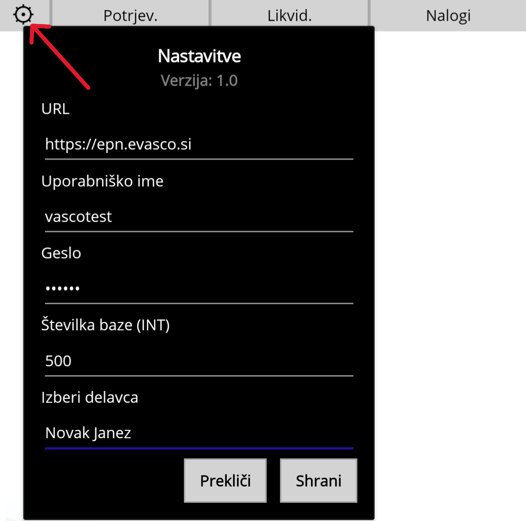 Po zagonu aplikacije se nam odpre prijavno okno, oziroma ga prikličemo z gumbom v levem zgornjem kotu (označeno na sliki spodaj). Vpišemo prijavne podatke: