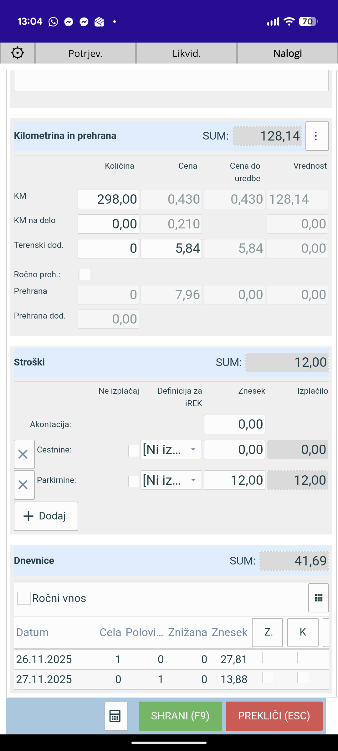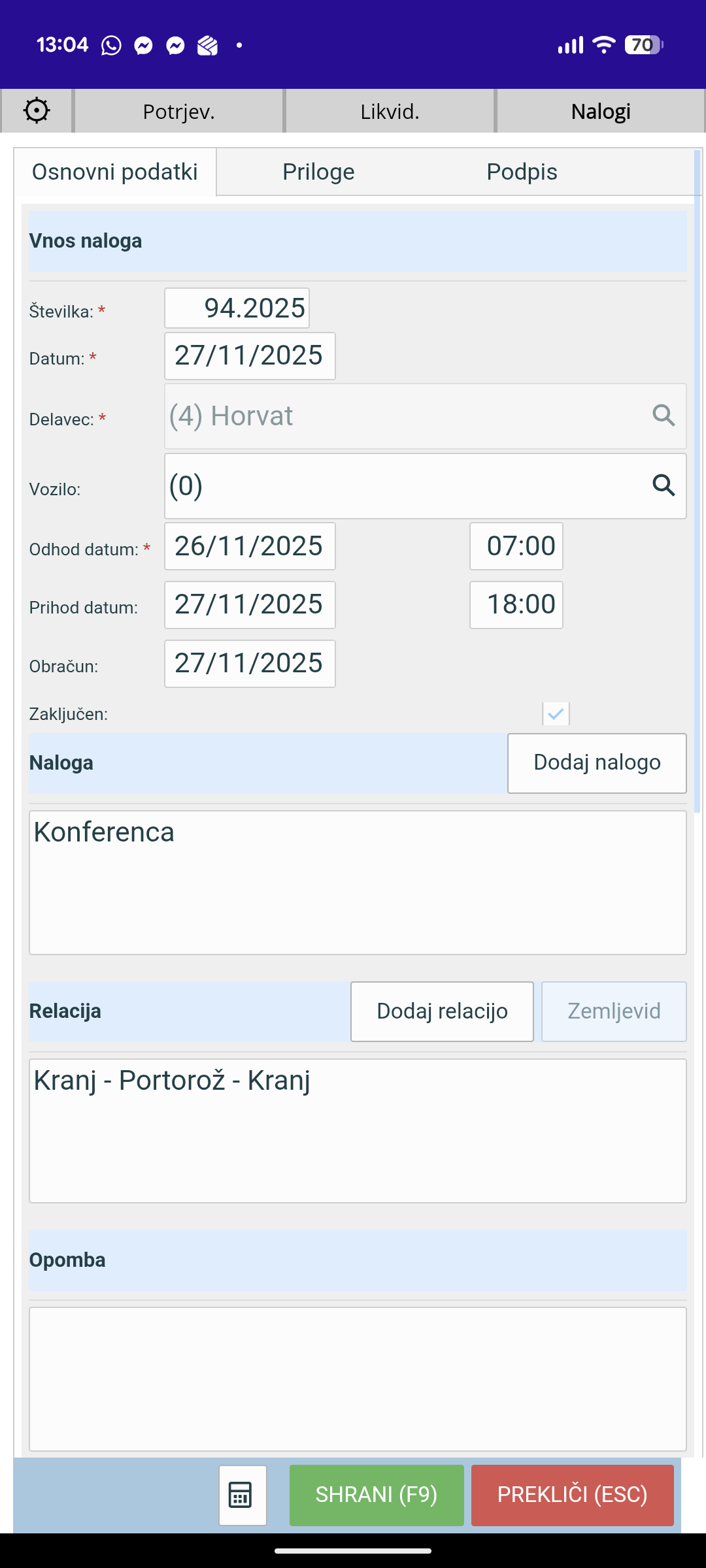 Za vnos novega naloga izberemo gumb +Dodaj. Odpre se nam okno za vnos naloga pri čemer se samodejno določi naslednja prosta številka in delavec v katerega smo prijavljeni. Enako kot v spletni verziji programa (ePN) vnesemo še datum odhoda, prihoda, nalogo in relacijo. Vpišemo kilometrino in stroške, ki nastanejo na poti. V primeru daljših potovanj, se samodejno obračunajo tudi dnevnice.