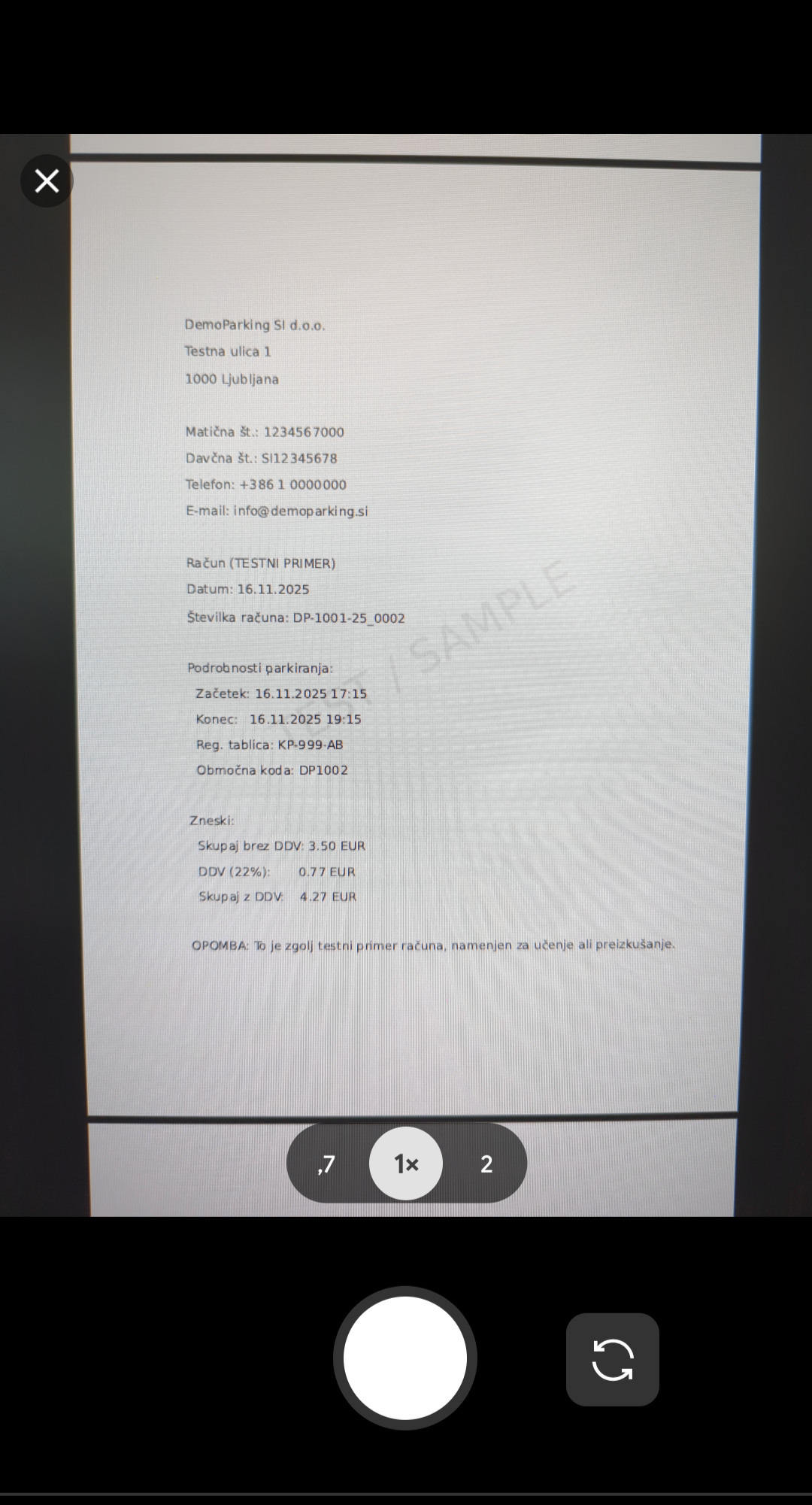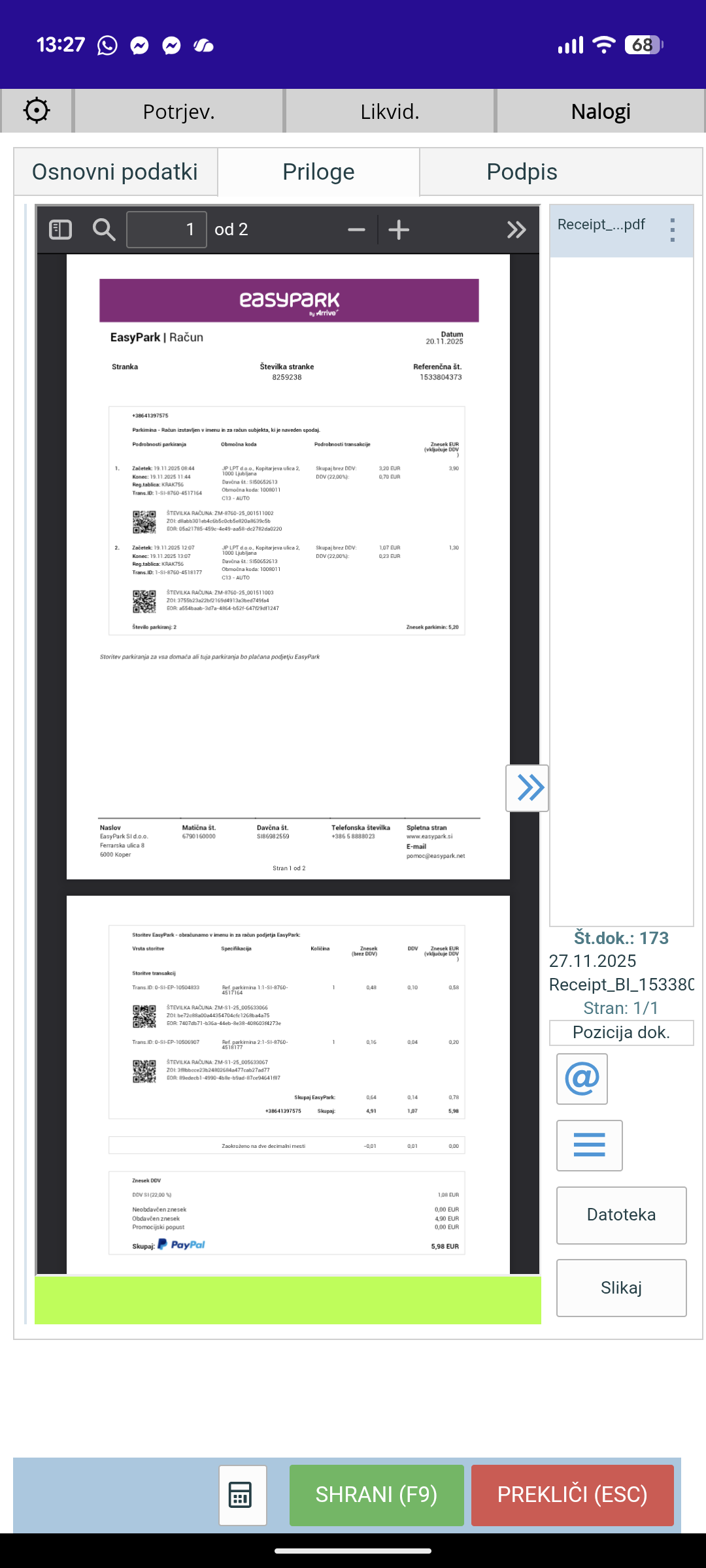 Slikamo račun/želeno prilog s telefonom. Na zavihku “Priloge” na vnosu ali urejanju naloga pritisnemo gumb “Slikaj“. Odpre se nam kamera našega telefona. Naredimo sliko računa in potrdimo vnos. Slika se nato pripne nalogu.